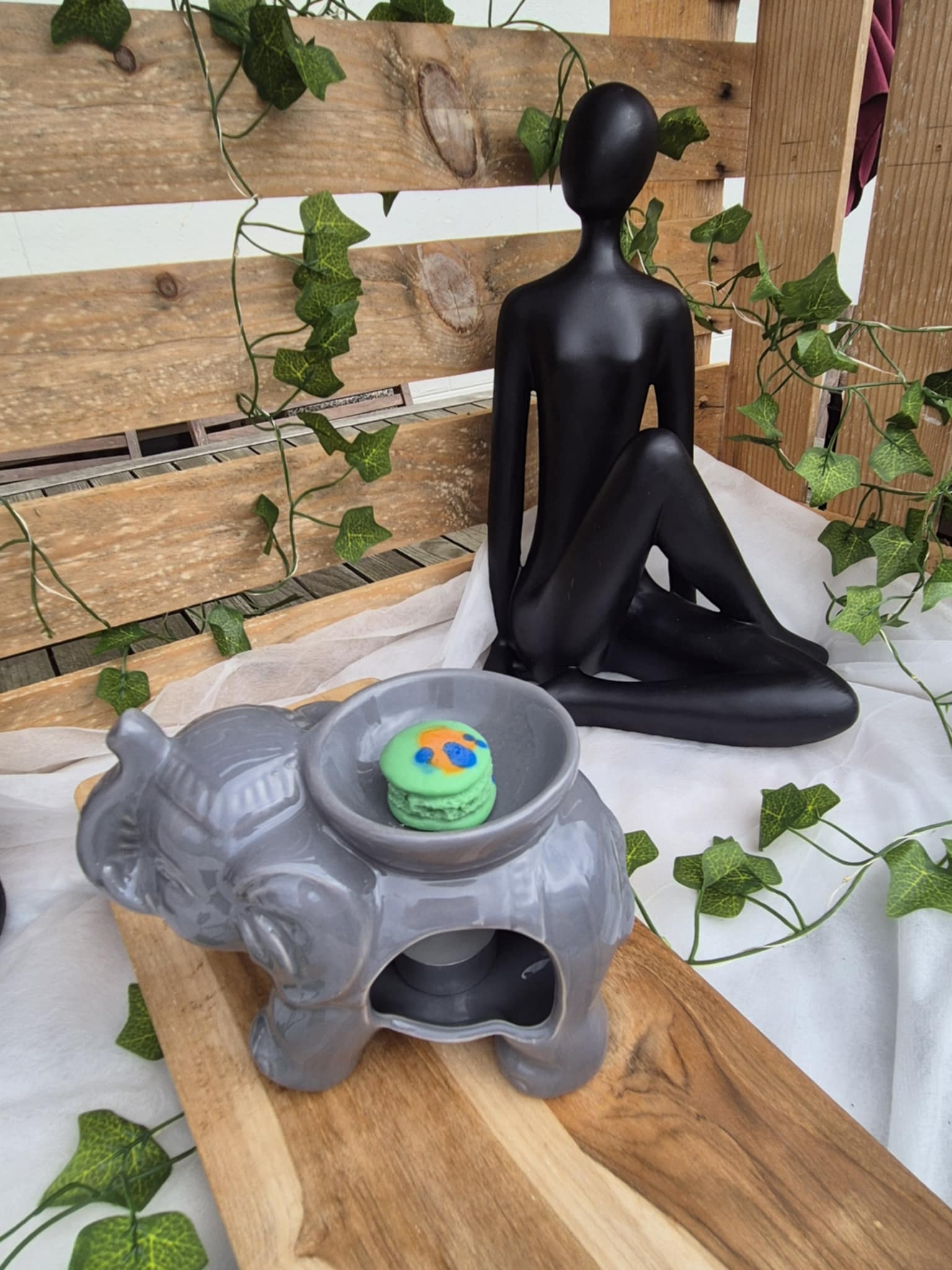Bien que son apparence soit gourmande, ce macaron est une création parfumée en cire. Il n’est pas destiné à être mangé. Le client est informé et doit prévenir son entourage, notamment les enfants.